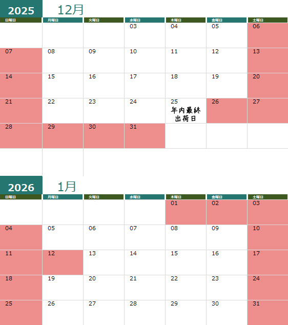 休業前は生産の混雑が予想されますのでお早目のご注文をお願いいたします。
